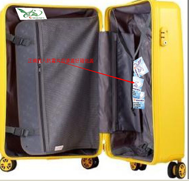 2)蓋好箱蓋后,因箱包外套PE袋或者外箱(紙盒),可以在PE袋子內(nèi)(或紙盒)內(nèi)也放置兩到三片防霉片,可預(yù)防箱包在倉(cāng)儲(chǔ)或者海上長(zhǎng)時(shí)運(yùn)輸發(fā)霉長(zhǎng)斑。