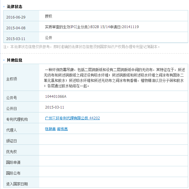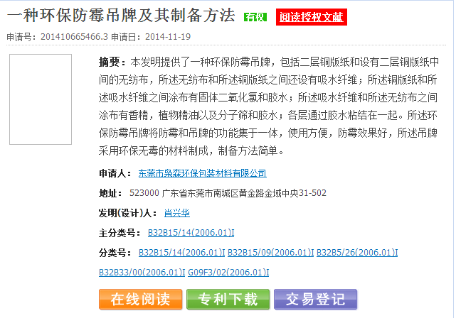 本發(fā)明提供了一種環(huán)保防霉吊牌,包括二層銅版紙和設(shè)有二層銅版紙中間的無(wú)紡布,所述無(wú)紡布和所述銅版紙之間還設(shè)有吸水纖維;所述銅版紙和所述吸水纖維之間涂布有固體二氧化氯和膠水;所述吸水纖維和所述無(wú)紡布之間涂布有香精,植物精油以及分子篩和膠水;各層通過膠水粘結(jié)在一起。所述環(huán)保防霉吊牌將防霉和吊牌的功能集于一體,使用方便,防霉效果好,所述吊牌采用環(huán)保無(wú)毒的材料制成,制備方法簡(jiǎn)單。