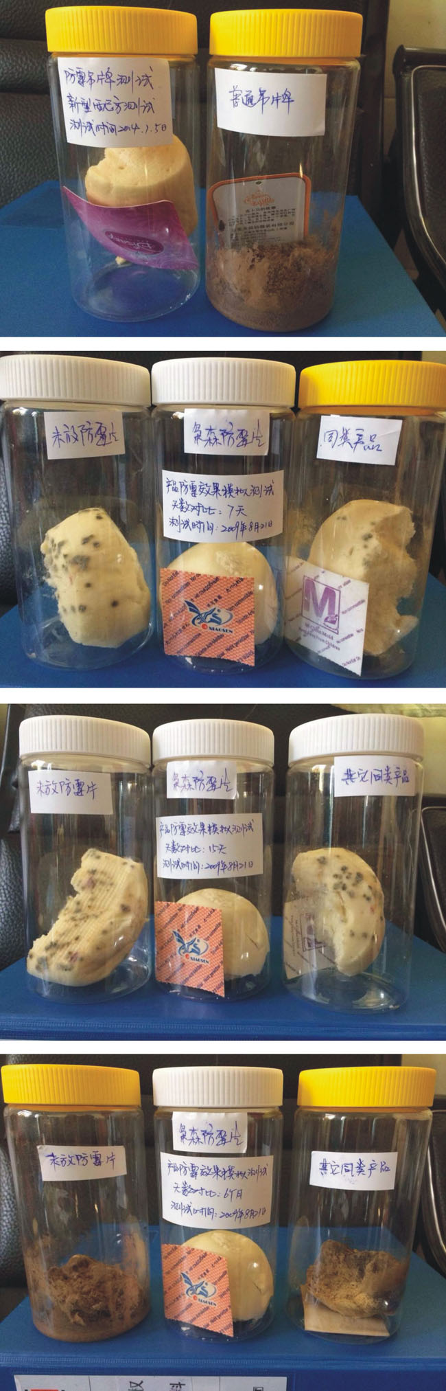 防霉模擬測式法。在隨大貨抽檢撕下一片防霉片放入透明的玻璃杯中,再在杯中放入半個饅頭,同時準備兩個杯,一個放防霉片,一個不放防霉片,同時蓋好兩個杯子的杯蓋。在把杯蓋上寫好作實驗的時間,這樣兩個杯子的模擬測試就作成了。28天內(nèi)你可以隨時觀察兩個杯子的發(fā)霉情況,如果放防霉片的杯子在3到6個月沒啥變化,那么這個品牌的防霉片就絕對沒有問題了!